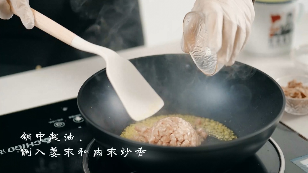 2.锅点火倒少许油,油热后倒入姜末略炒一下,倒入肉末炒熟。