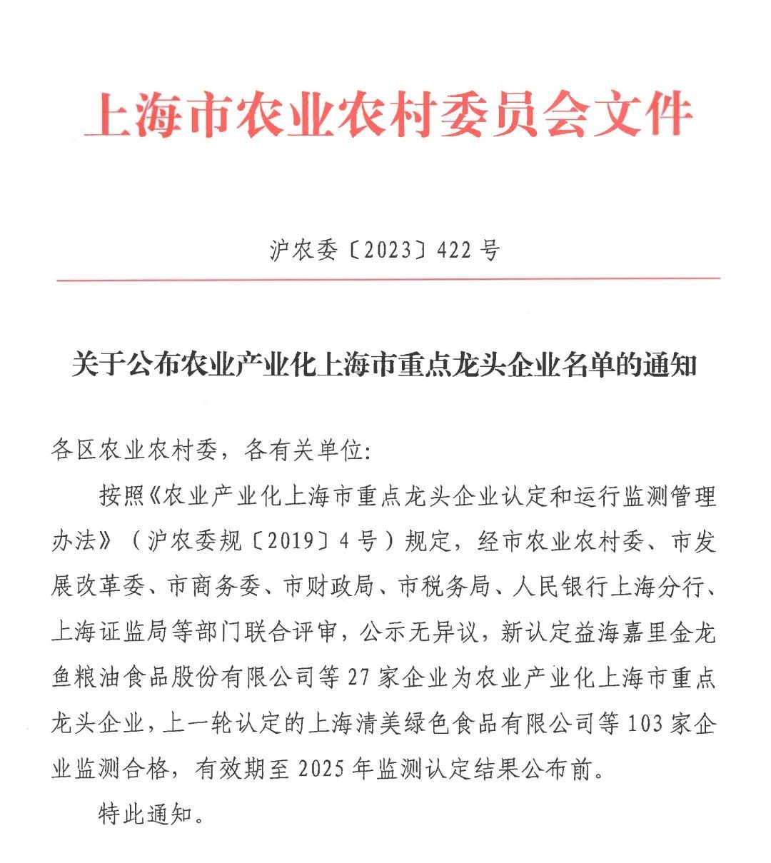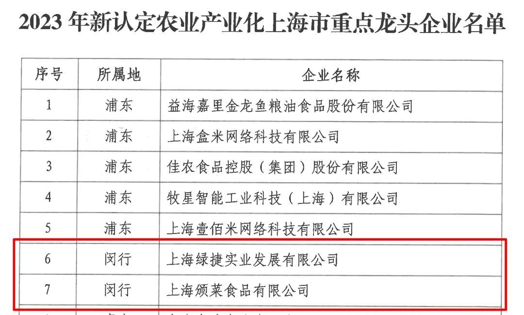 近日,市农业农村委公布农业产业化上海市重点龙头企业名单,闵行区上海绿捷实业发展有限公司和上海颁菜食品有限公司两家农业企业获评农业产业化上海市龙头企业。截至目前,闵行区区级以上农业产业化重点龙头企业共有5家。