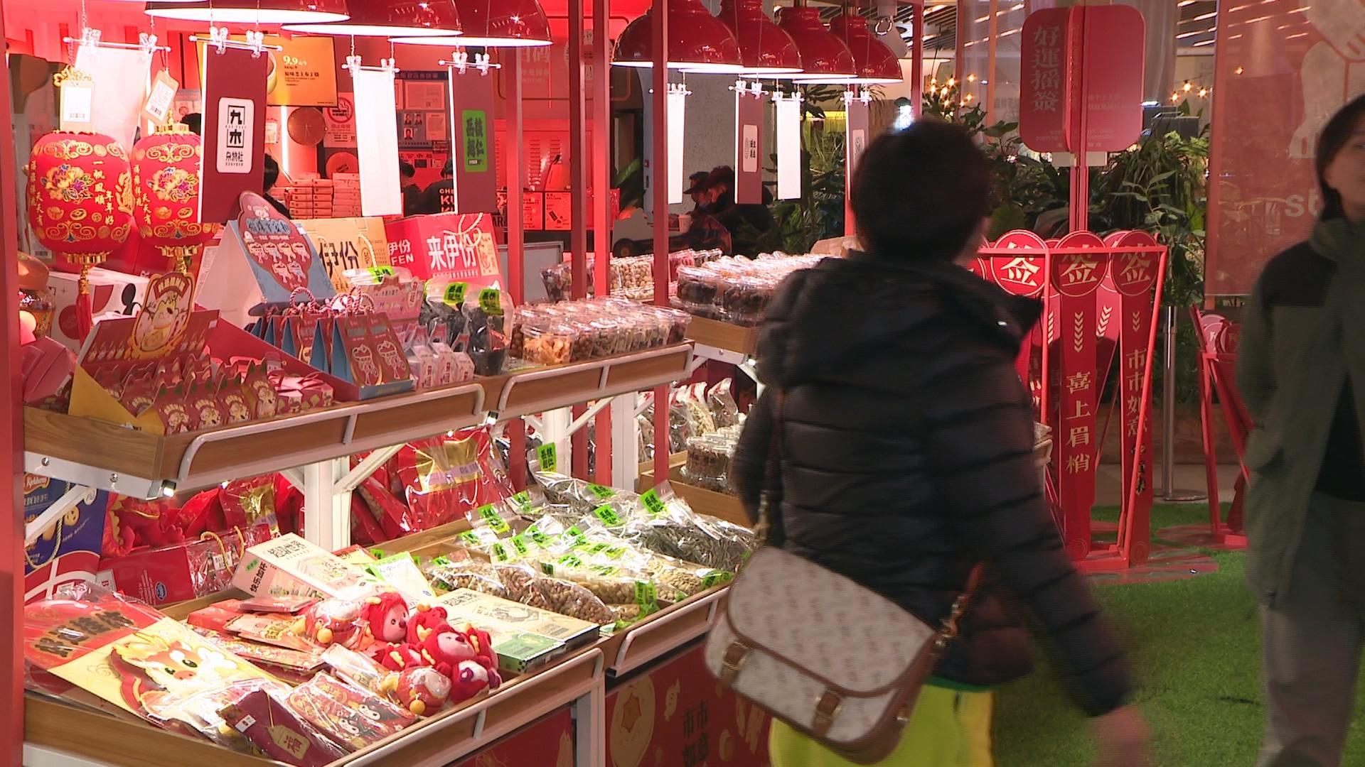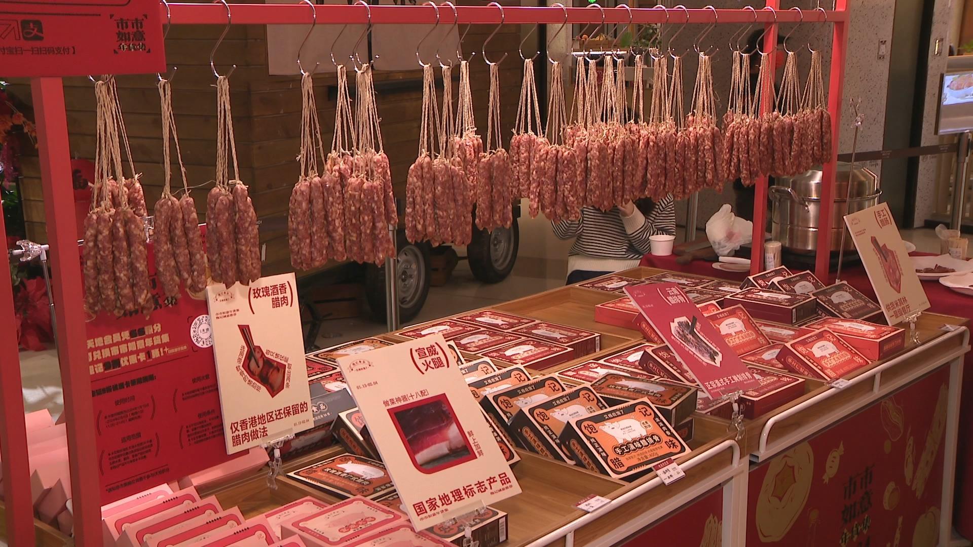 走进太阳宫五楼中庭,年货集已经摆满了各种年货,从香肠到坚果,从水果到压岁福袋,都是中国人过年的传统,充满了浓浓的年味。市民程小姐告诉记者,这个市集开在商场里很方便,在逛商场的时候就可以一下子把年货都买了。而且这里的商品品类很丰富,坚果、零食、水果、腊味,甚至鸡肉羊肉这边都有,有的好物也是很难买到的。瑞虹天地助理总经理夏芝仪告诉记者,这次“市市如意年货集”在选品方面也是尽可能地希望为大家引入高品质、有特色,甚至可能有一些单品在产能方面也是比较稀缺的,包括有新年限定的广式腊肠,有非遗的年糕、非遗的酒酿,有上海金标的黑山羊,还会有援滇的老母鸡等这些特色的产品。