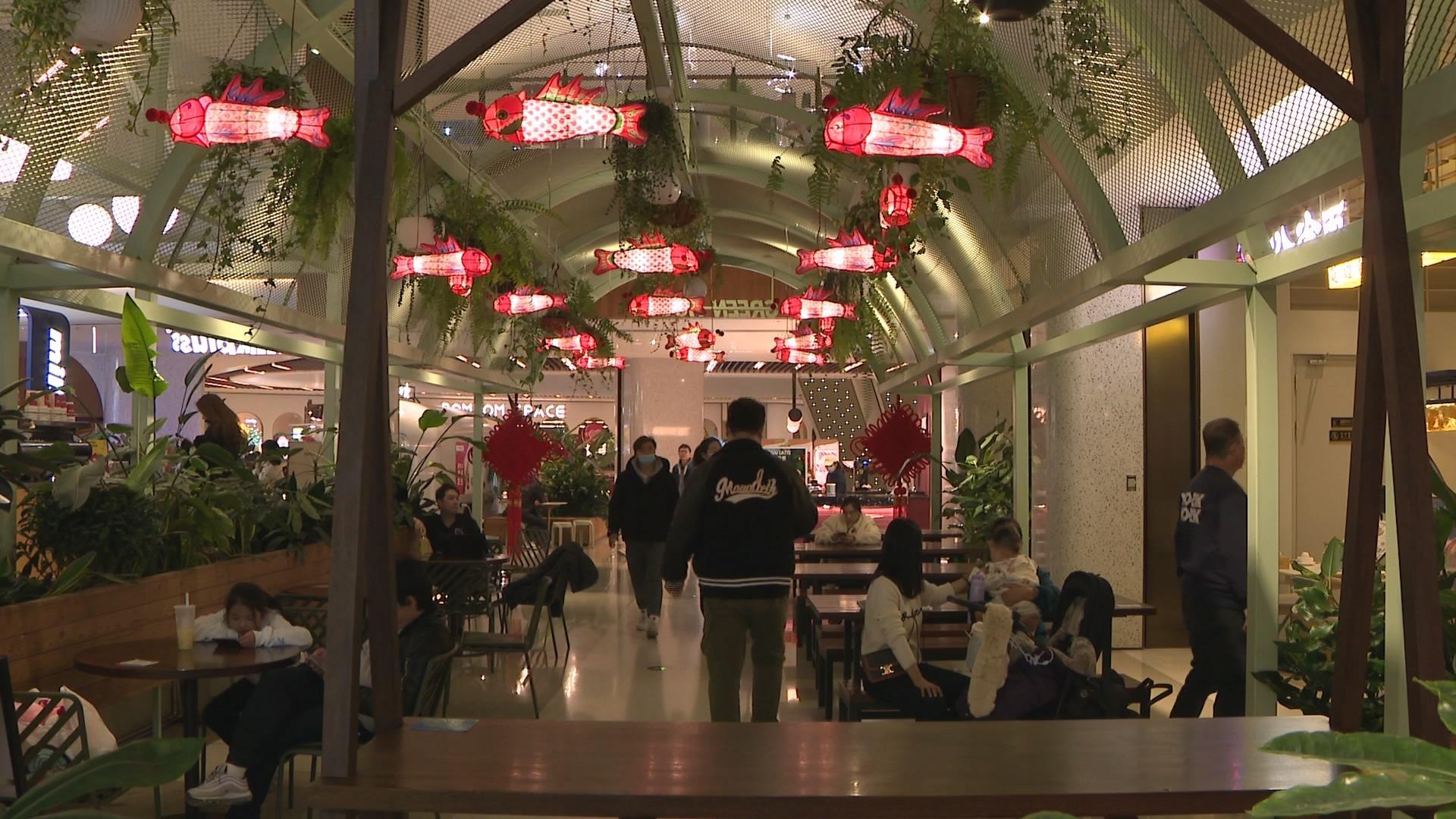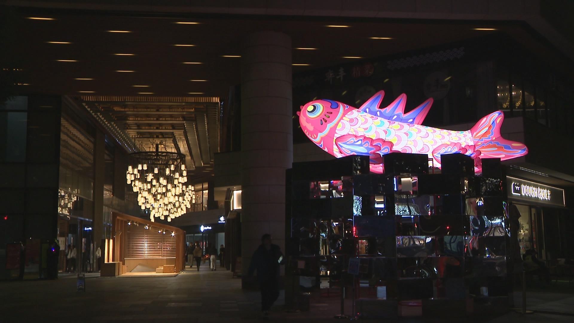 夜幕降临,硕大象征美好寓意的鱼灯把瑞虹天地的入口装饰得格外耀眼,胖墩墩的身材、剪纸造型的鱼身,充满了中国传统的文化。而在一楼中庭广场,卡通造型的各种龙的造型萌动可爱,各种寓意美好的祝福条幅让现场格外喜庆。主办方也在春节期间安排了各种丰富多彩的民俗活动。市民王女士告诉记者,这里的迎新气氛还是蛮浓郁的。平时节假日,月亮湾、太阳宫都会搞一些活动。这次大年初一一直到十五,每天都有不同的活动,准备每天带小宝宝来玩。