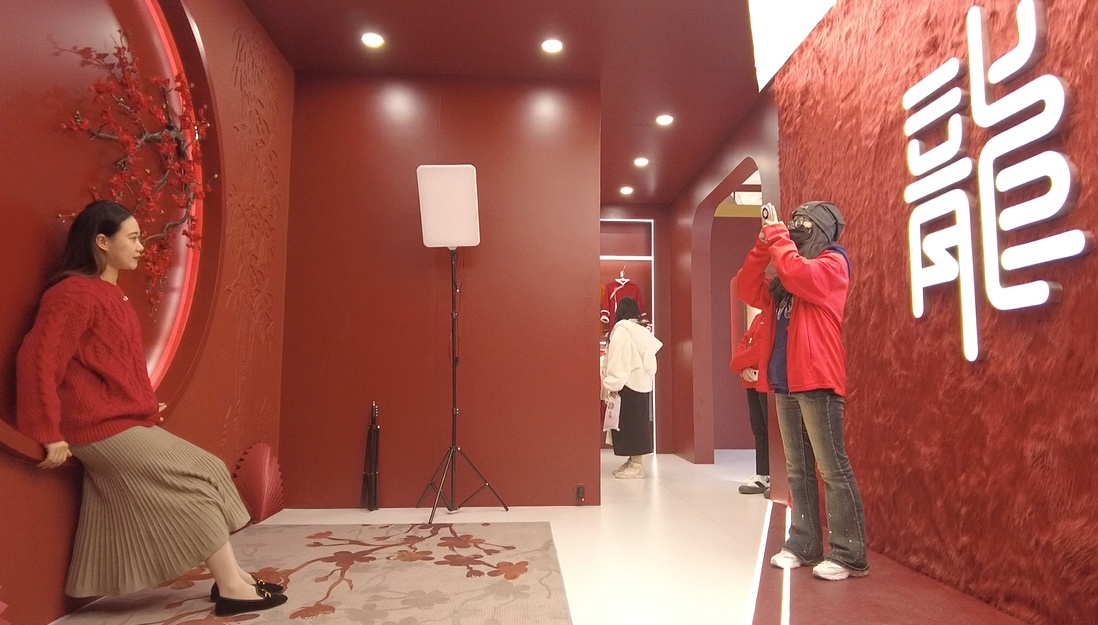 春节将至,对很多人来说,跟家人、朋友一起团聚打卡的照片都是极具新春仪式感的。这几天,在新世界大丸百货中庭,一间以红色为主色调,金色龙纹作为点缀的华为新年照相馆吸引了不少市民游客的目光。在照相馆的“欢聚厅堂”里,市民可以免费拍摄新年全家福大片,定格美好、共享年味。