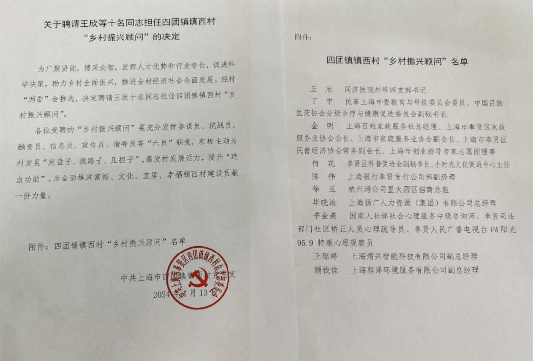 △关于聘请王欣等十名同志担任四团镇镇西村