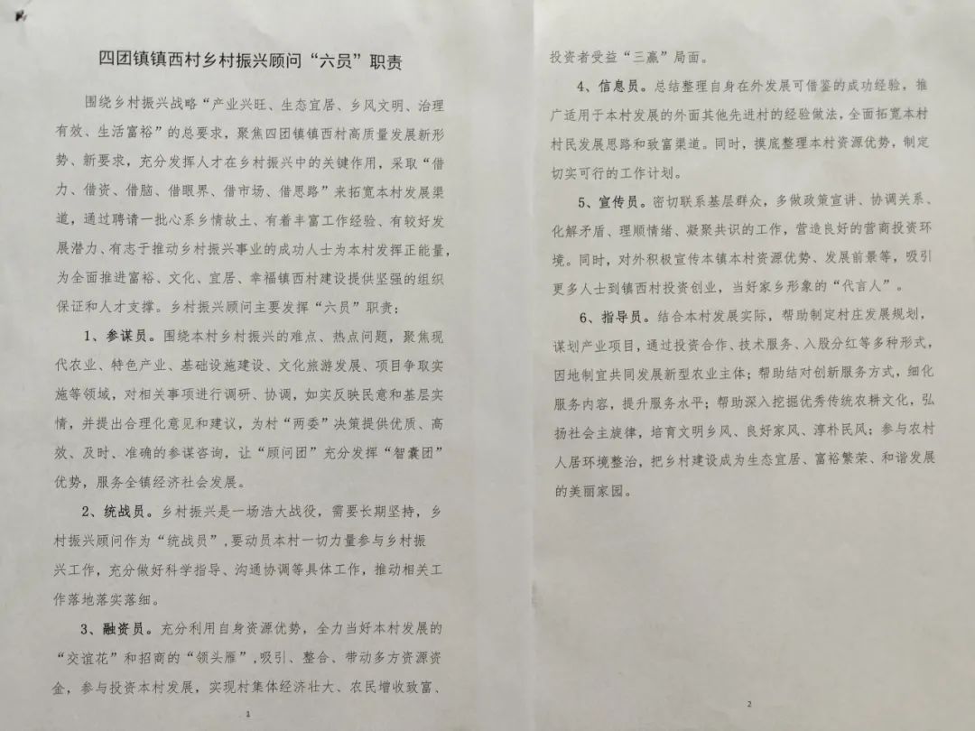 此次聘任的首批乡村振兴顾问共有10位,来自乡村创业、医疗健康、招商平台、人力资源环保科技、心理咨询等领域。这些顾问将结合个人专长,充分发挥参谋员、统战员、融资员、信息员、宣传员、指导员等“六员”职责,积极主动为农村发展“定盘子、找路子、压担子”,激发内生动力,增强“造血功能”,为全面推进富裕、文化、宜居、幸福镇西村建设贡献一份力量。