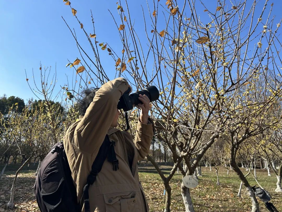 摄影爱好者袁先生特意驱车从浦东赶来赏花:“听说这里有很多种蜡梅,就想过来看下。而且今天天空很蓝,拍出来的照片很漂亮。”