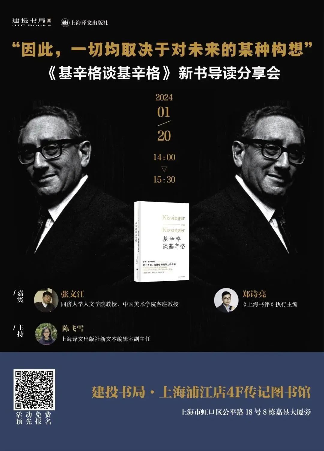 本次分享活动特别邀请到同济大学人文学院教授张文江老师,《上海书评》执行主编郑诗亮老师,以及《基辛格谈基辛格》的责任编辑陈飞雪老师,一起聊聊这位外交家的人生、思想渊源、外交战略,并对新书做初步的导读。