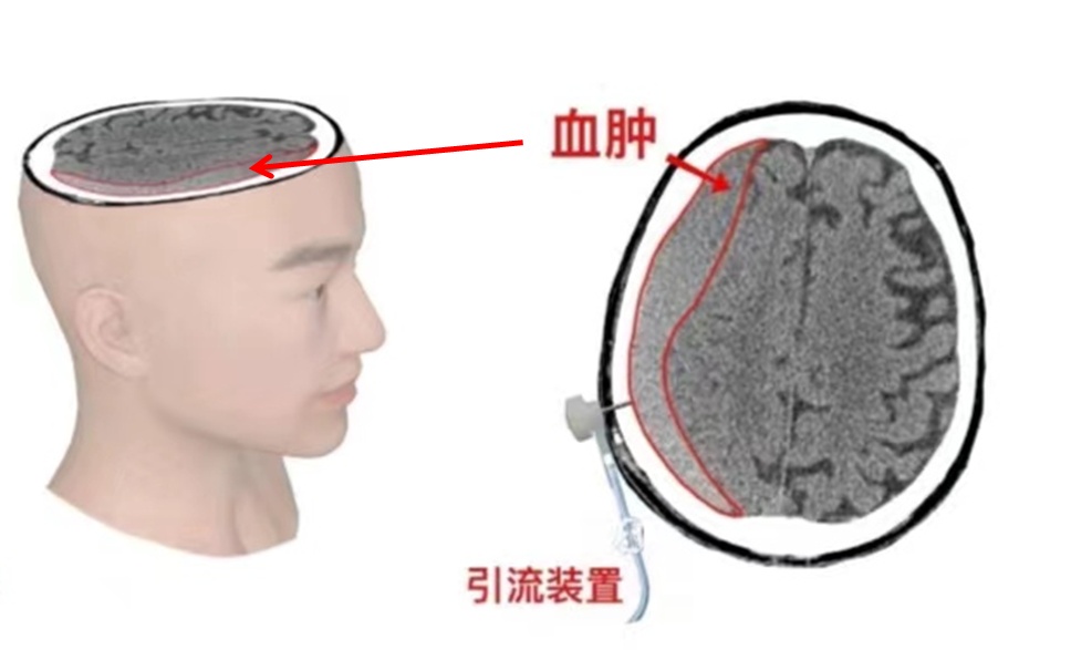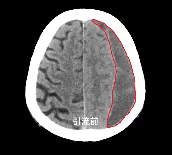 整个手术过程在局部麻醉下进行,仅在头皮注射一针麻药,将引流穿刺针经头皮颅骨穿刺进入血肿部位通过引流管将出血排出体外。手术操作过程约 10 分钟,术后患者头昏肢体无力症状明显改善,术后一天,神志也清楚了,可以正常交流,不能动弹的肢体活动自如,复查头颅 CT 可见颅内积血已基本完全引流出来。