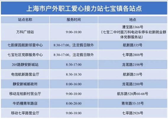 寒冷冬季,七宝镇共有9家户外职工爱心接力站,冷可取暖、渴可饮水、累可歇脚,点位详见↓