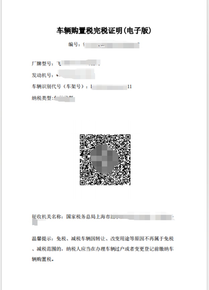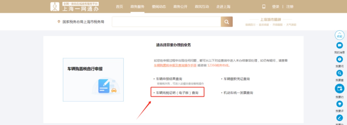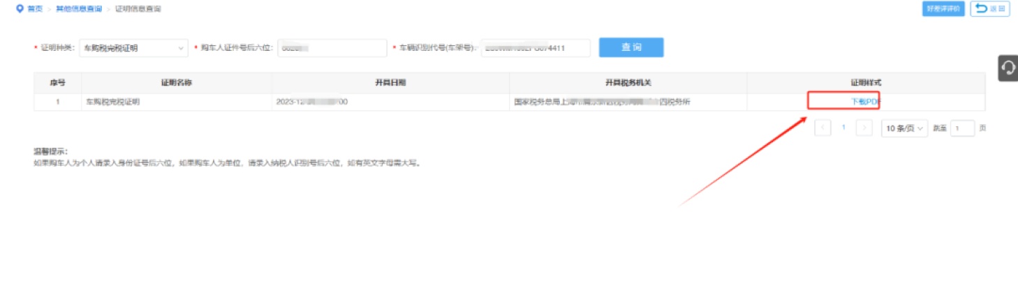 第四步,点击【车辆完税证明(电子版)查询】,进入该模块后,证明种类中下拉框选择“车购税完税证明”,输入查询车辆的车辆识别代号和企业或自然人信息,点击“查询”。