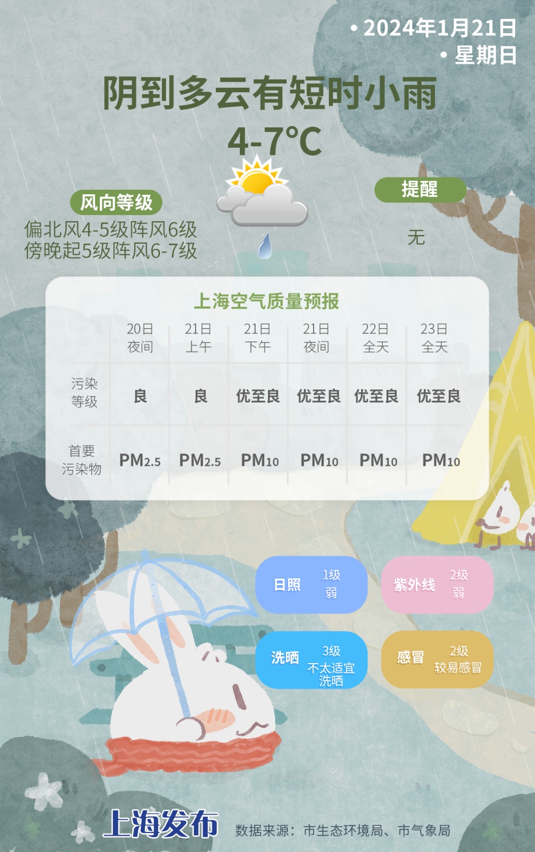 明天本市维持阴到多云有短时小雨的天气,雨水偏弱,对出行影响不大。不过气温受到压制,起伏较小,在4-7度附近。偏北风4-5级阵风6级,傍晚起5级阵风6-7级,风寒效应下,体感更显阴冷。相对湿度95-60%。
