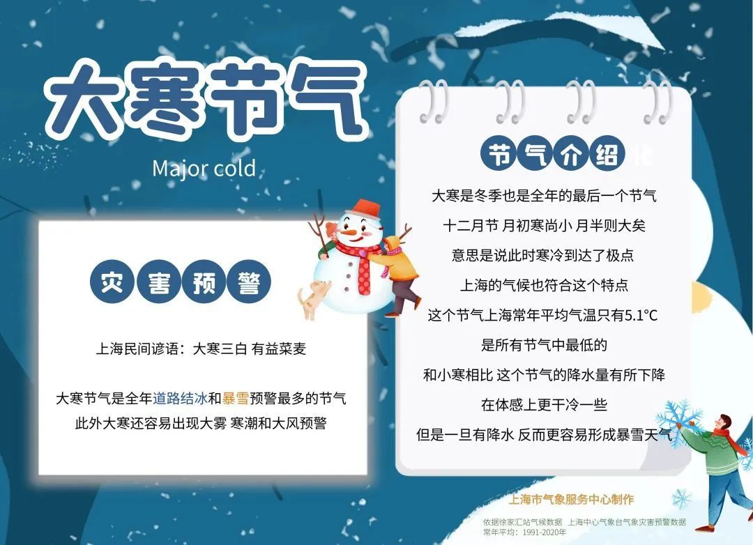 2024年1月20日开启大寒节气,这是二十四节气最后一个节气。十二月节,月初寒尚小,月半则大矣。上海的气候也基本符合这个特点。这个节气上海常年平均气温只有5.1度 ,是所有节气中最低的。和小寒相比,这个节气的降水量有所下降,在体感上更干冷一些,但是一旦有降水,反而更容易形成暴雪天气。