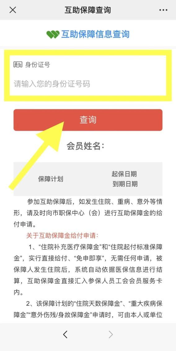 进入申工社微信公众号,点击“服务大厅-互助保障查询”,输入“身份证号”即可在线查询。