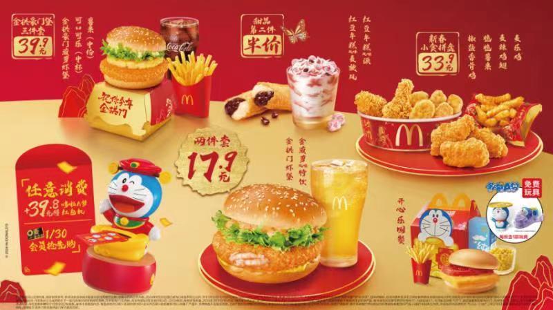 更值得期待的是,1月27日至2月25日,麦当劳中国将推出金拱门堡、椒盐香骨鸡、红豆年糕派在内的12款新春限定美味,还有一系列为新春定制的华美鎏金包装也将随新品限时焕新。1月24日起,购买麦当劳开心乐园餐即可随机获得一款哆啦A梦系列玩具。1月31日起,为龙年新春特别打造的“哆啦A梦红包机”也将上架发售,这个造型可爱的哆啦A梦身着中式服装,更身怀旋转发红包的“绝技”,为新春聚会增添欢笑和祝福。