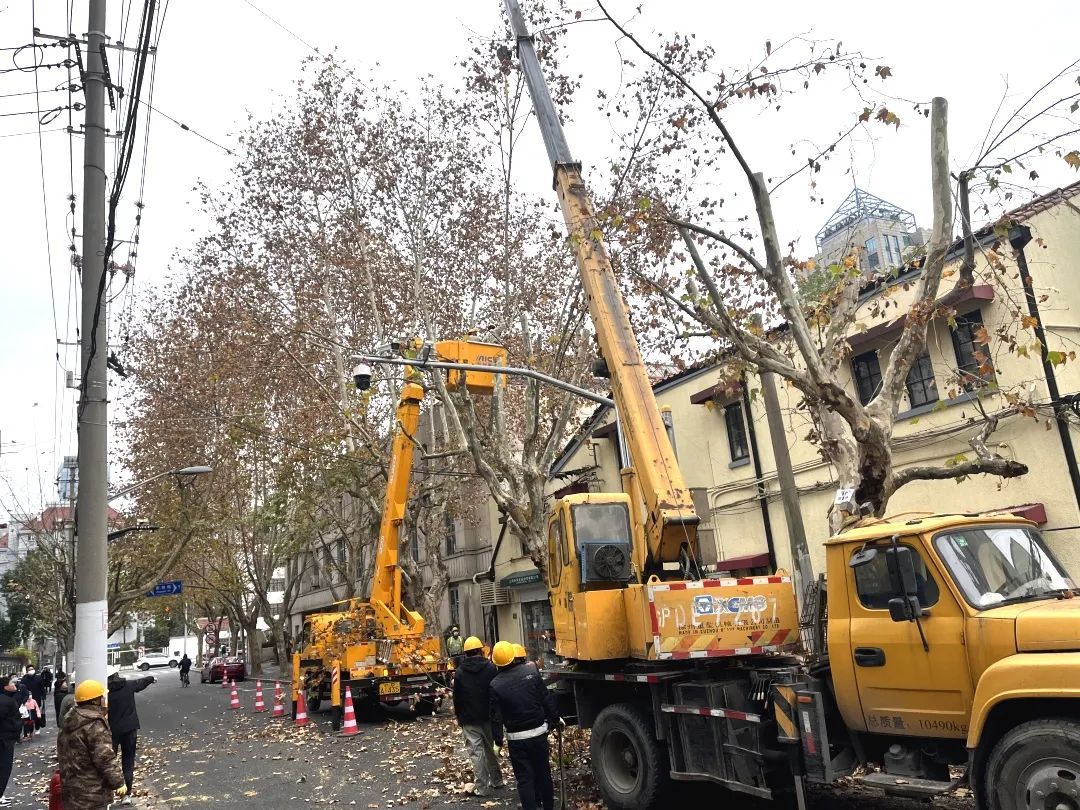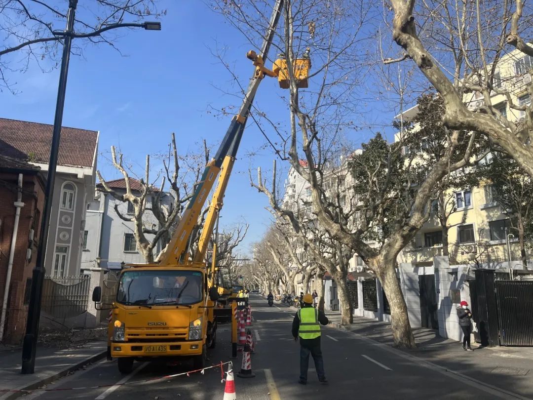 行道树三分种、七分养,冬季行道树修剪是绿化养护管理的一项重要内容。为防范应对低温雨雪天气可能对树木造成的影响,解决树木头重脚轻、遮挡阳光等问题,排除树房、树线等安全隐患,同时控制飞絮,打造统一街景,徐汇区于近期启动衡复风貌区道路机械化登高修剪工作。