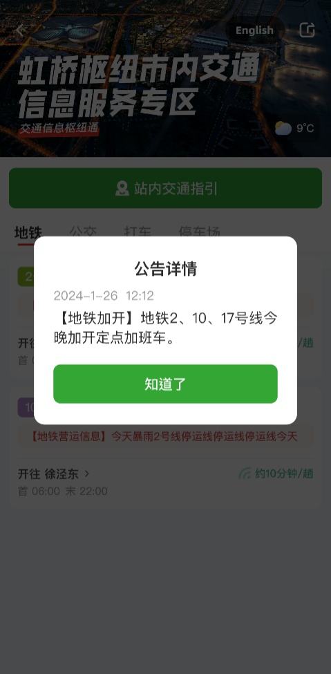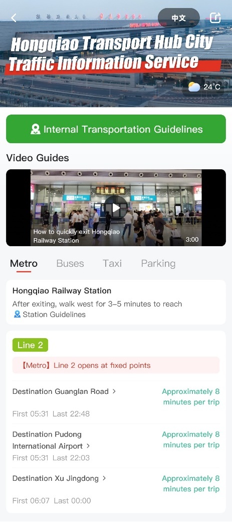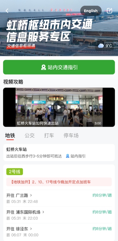 一键体验虹桥火车站实时交通运行信息、站内出行指引、应急预警、天气查询、公共交通“一码通行”等一站式双语出行服务。