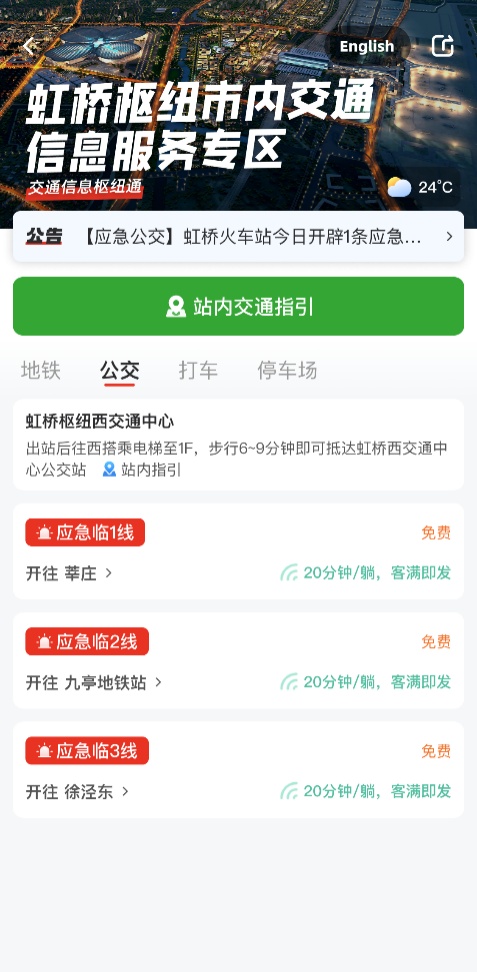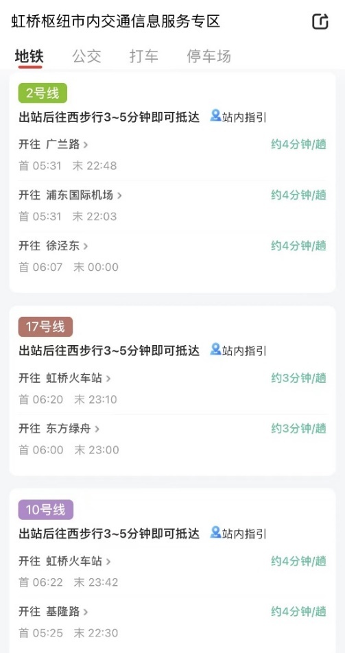 “虹桥枢纽市内交通信息服务”专区提供24小时全天出行信息服务。