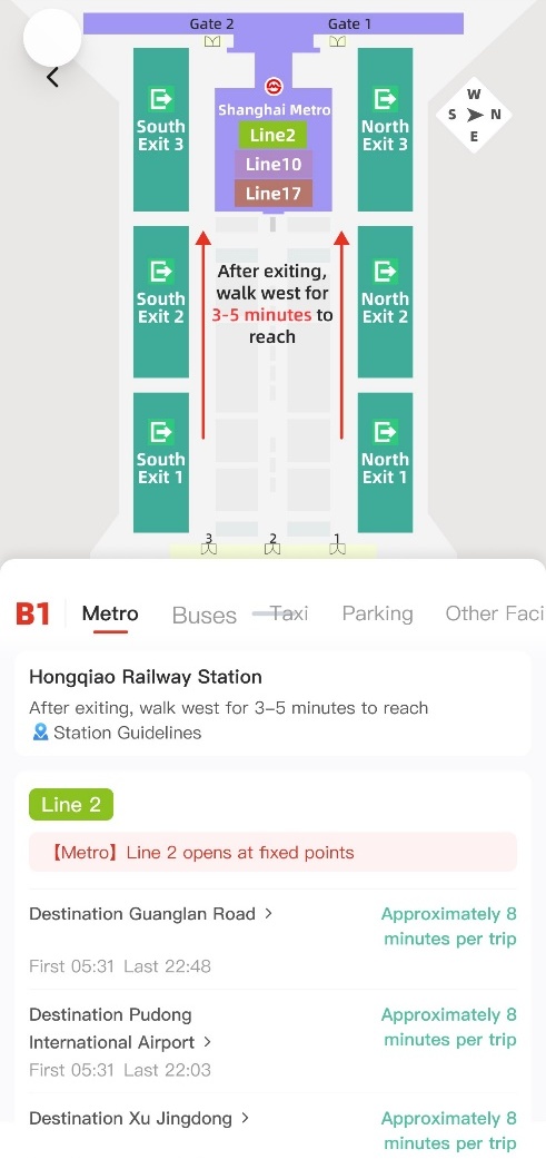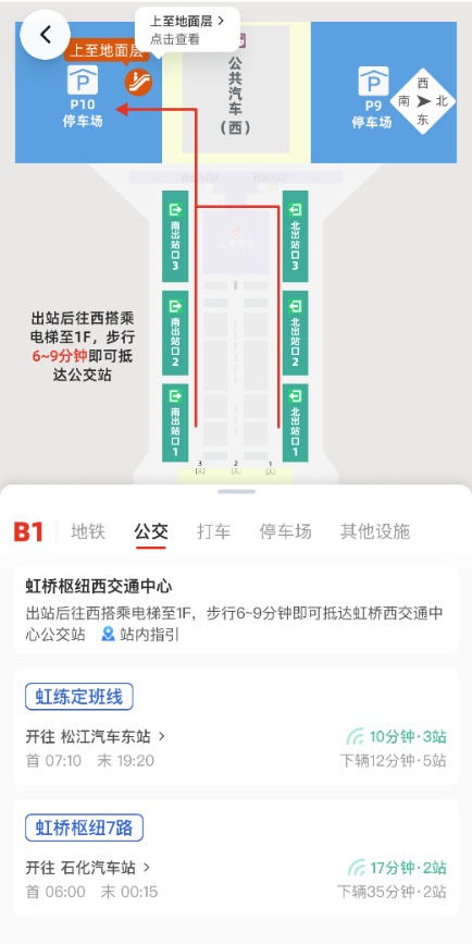 到站旅客打开“虹桥枢纽市内交通信息服务”专区首页,点击进入“站内交通指引”,可便捷查询地铁、公交、打车、停车场以及其他服务设施,虹桥火车站B1到达层各种交通方式的上客点均以平面图的形式清晰整合。