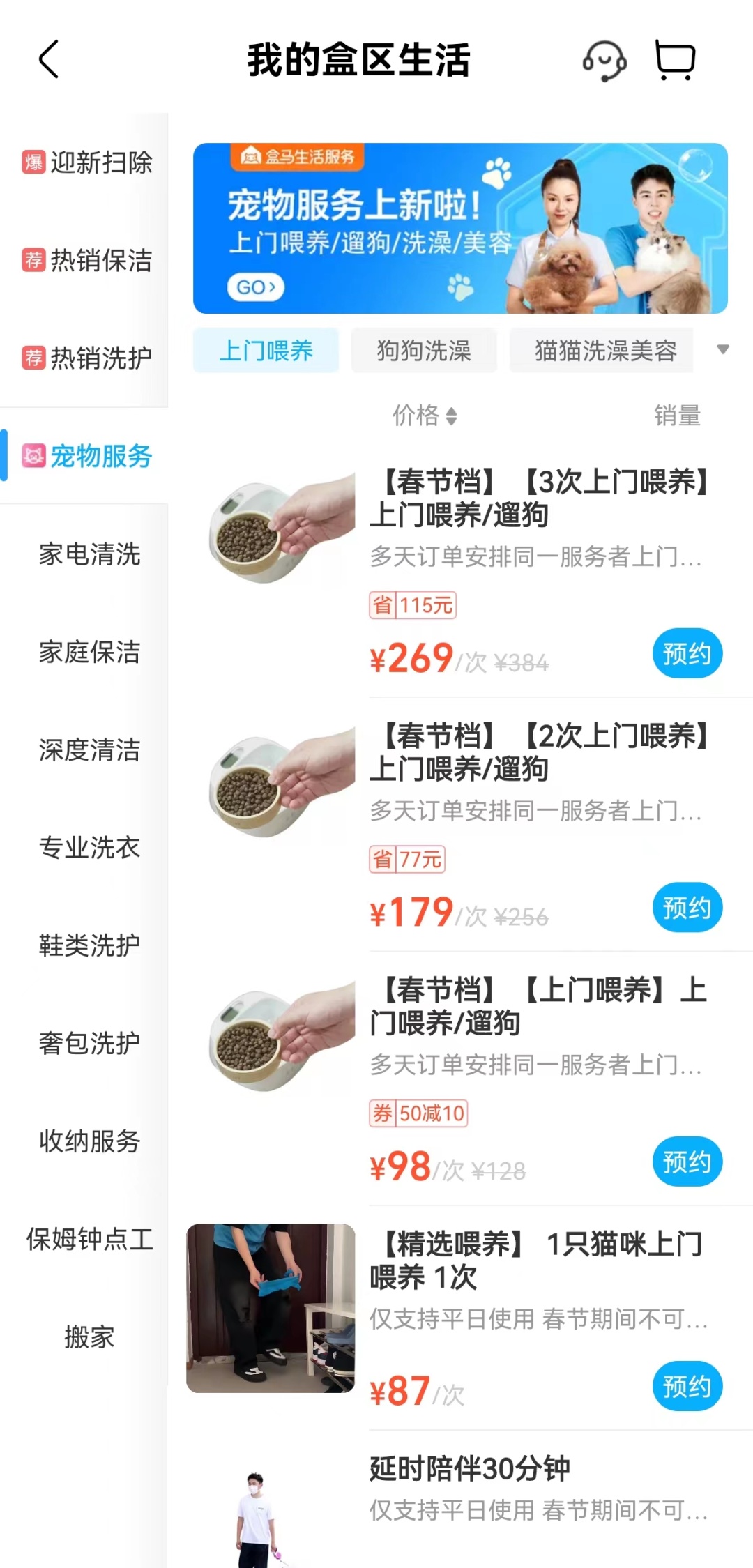 在盒马App的生活服务板块,上新了春节档上门喂养及遛狗服务。盒马表示该服务仅限春节期间使用,可约日期为腊月二十七至正月初七,服务过程有专人对接、全程直播,主要内容为上门换水喂粮、遛狗陪玩等,顾客预订成功后会有专人联络。目前,盒马万科天空店、夏都小镇店可以享受这项服务。