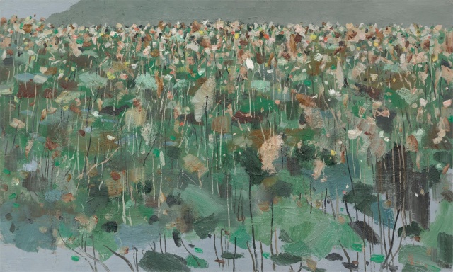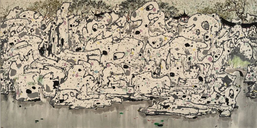 吴冠中则水墨、油画并进,自由出入于梵高、马蒂斯、郁特里罗、蒙德里安、波洛克等西方现代派大师,为水墨艺术开创了抽象的一种范式,也为世界油画提供了新的可能性,让中国油画有了自身的形式逻辑和艺术风格。亮相展览的巨幅彩墨画《狮子林》作于1983年,即为吴冠中以东方之韵吞并西方形色的早期代表作。画面流动的点线曲折盘旋、横来竖去,朱砂、石青、石绿、藤黄等色彩像五彩斑斓的宝石一样,随墨点镶嵌在波涛汹涌的银色韵律中;具象、抽象、幻象,石头、树木、亭宇、回廊、小桥、池水、游鱼,一切都融入混沌的势象律动中,一派东方绘画的风骨和神韵。
