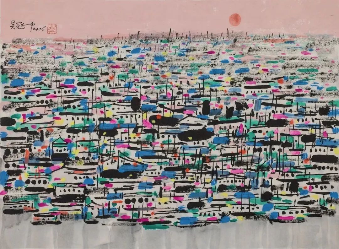 林风眠对传统笔墨的态度尚留有余地,援引各类民间艺术鲜活的技艺稀释清末以来日趋狭隘的文人审美趣味,吴冠中则和传统笔墨进一步划清了界线。吴冠中于1992年提出“笔墨等于零”,认为笔墨只是工具和手段,但中国绘画界形成了以笔墨来衡量一切的品评习惯,使创作被各种笔墨程式和框架所桎梏不能得以自由挥洒。吴冠中的水墨画属于现代型水墨,从造型、点线面的构成和色彩关系等入手去自由使用水墨媒材,甚至用排笔、大刷子或针筒注射隔空滴洒等方式不择手段、择一切手段去打造画面效果。此次展出的吴冠中晚年的《彩无极》《晚钟》《红绿层楼》《海港晨曦》《雨花江》等一批作品,或以丰富的色点构成一个色彩斑斓的艺术世界,或以标志性的抽象笔法在方寸之间营造自然景观。这些虽然不是传统笔墨,但同样富于东方韵味和美感,并由此打开让更多人以水墨媒材创作的可能性,也打开水墨艺术的更多可能性。