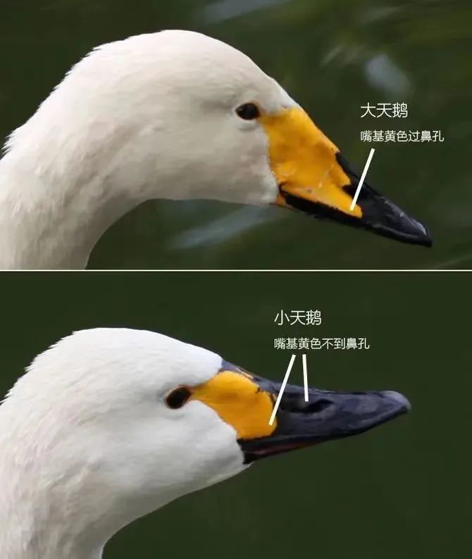 而大天鹅和小天鹅则长得非常相像,大天鹅的喙以黄色为主、喙尖黑色;小天鹅的喙以黑色为主,喙基部分小范围黄色。