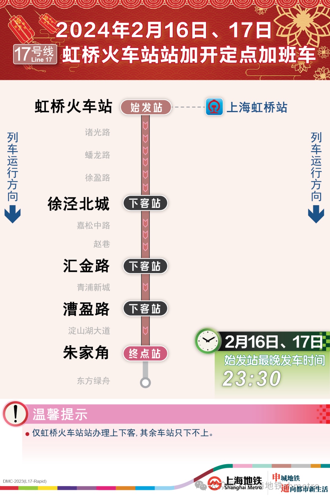 2月16日、17日(周五、周六)连续两天,地铁17号线虹桥火车站站往朱家角站方向将加开定点加班车:虹桥火车站站下行末班车(23:00)后加开2列定点加班车,虹桥火车站站发点分别为23:15、23:30。加班车沿途仅停靠虹桥火车站站、徐泾北城站、汇金路站、漕盈路站、朱家角站(终到站),其余车站跳停。停靠车站中,虹桥火车站站(始发站)办理上客,其余车站只下不上。 春运期间,每逢周日2号线虹桥火车站站夜间定点加班车延至0点。2号线定点加班车始发站虹桥火车站站,终点站龙阳路站,中途停靠虹桥2号航站楼站、淞虹路站、中山公园站、静安寺站、人民广场站及世纪大道站。其中除始发站虹桥火车站站及虹桥2号航站楼站可上下客,其余各停靠站都只能下客,途经换乘站不可换乘。