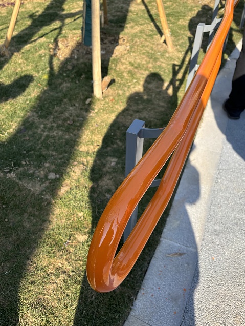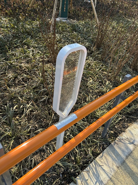 花园内盲道的外侧有扶手,根据身高不同设置了高矮两层,能满足残障人士与老年人的出行需要,扶手上还有所在位置与景观的盲文提示。