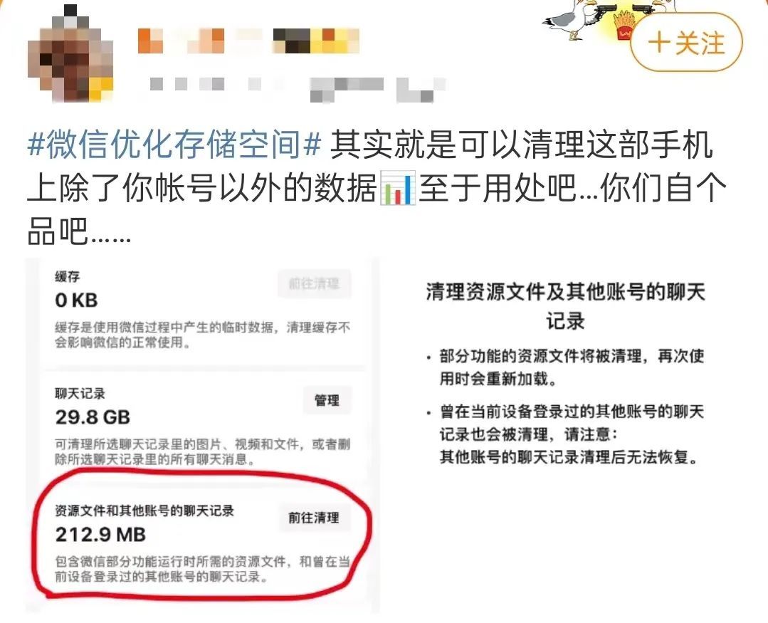 “资源文件和其他账号的聊天记录”包含微信部分功能运行时所需的资源文件,和曾在当前设备登录过的其他账号的聊天记录,可以清理;