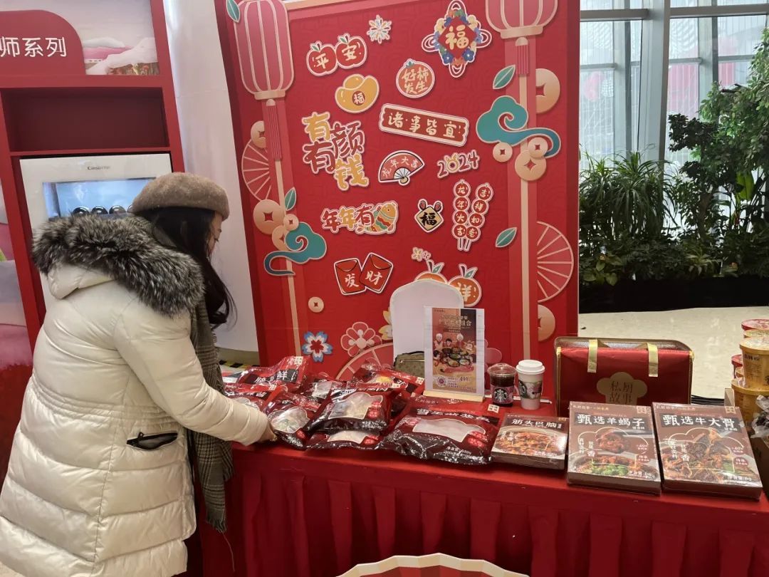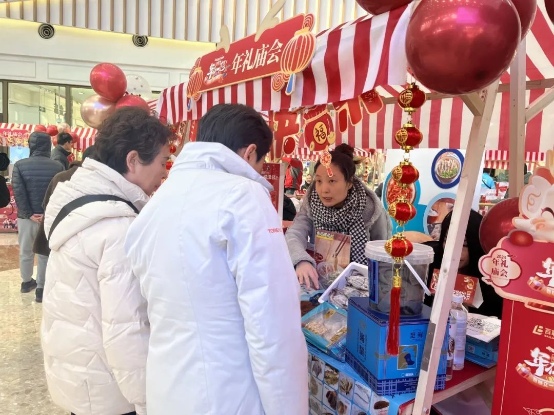 在一家海鲜礼盒摊位前驻足询价的朱阿姨和家人原本是来商场添置新衣,看到年货集市,便挪不开脚步了。“家里过年的小零食都买好了,还差点‘大菜’,这个礼盒的价格很合适,我看产品也很新鲜。”为了不耽误朱阿姨继续购物,店家也贴心地为朱阿姨提供了邮寄商品到家的服务。