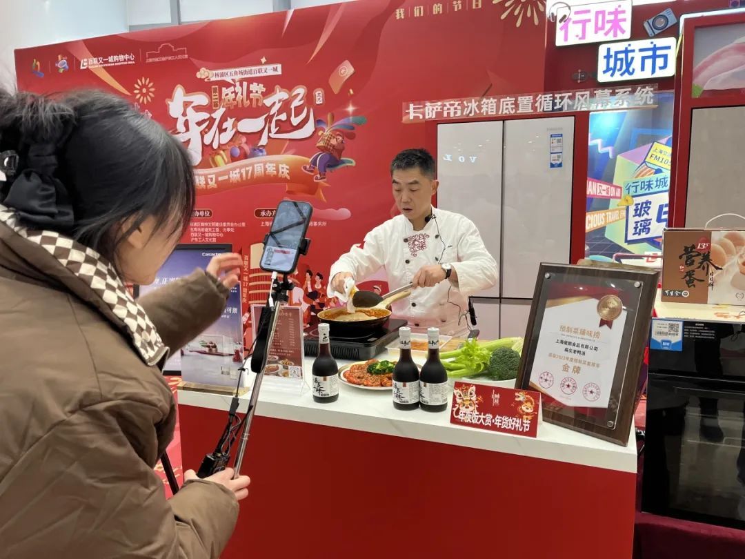 还在发愁年夜饭吃什么吗?一家售卖半成品年夜饭的摊位前,大厨则直接把厨房搬来了现场。线下,大厨忙着烹制红焖大虾、扁尖老鸭汤等一道道拿手好菜,线上的直播间里也下单火爆。“有时间烹制年夜饭的顾客可以跟大厨学一学怎么把菜烧得色香味俱全,没时间的顾客可以购买我们的年夜饭套餐,食材都是看得见的新鲜。”