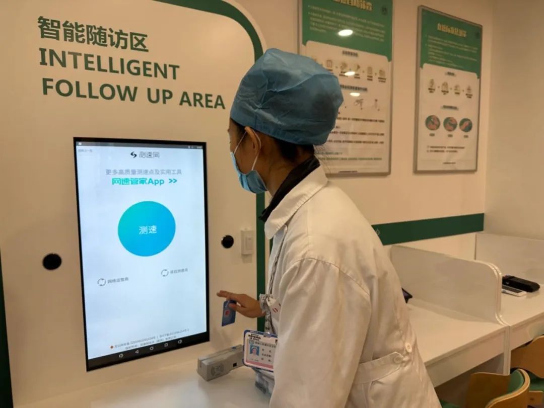 在社区卫生服务中心门诊大厅入口处,有一处角落总是来来往往许多居民,大家有序测量着血压、血糖等各项数据,并在智慧显示屏前查看自己的健康评测报告。