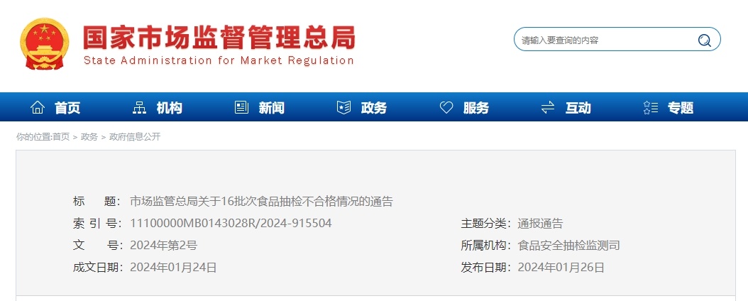 国家市场监管总局网站1月26日发布通告称,近期,市场监管总局组织食品安全监督,抽检1476批次样品,检出16批次样品不合格,对抽检发现的不合格食品,有关省级市场监管部门,已组织开展核查处置。