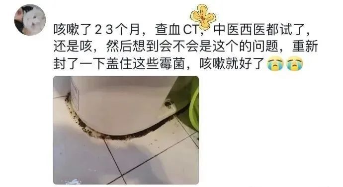 近日,有网友发帖称自己咳嗽老不好,各种检查治疗都试过了还是咳。后来发现家里马桶下面有一圈黑色霉菌,清理后重新封了胶,咳嗽竟神奇地好了!
