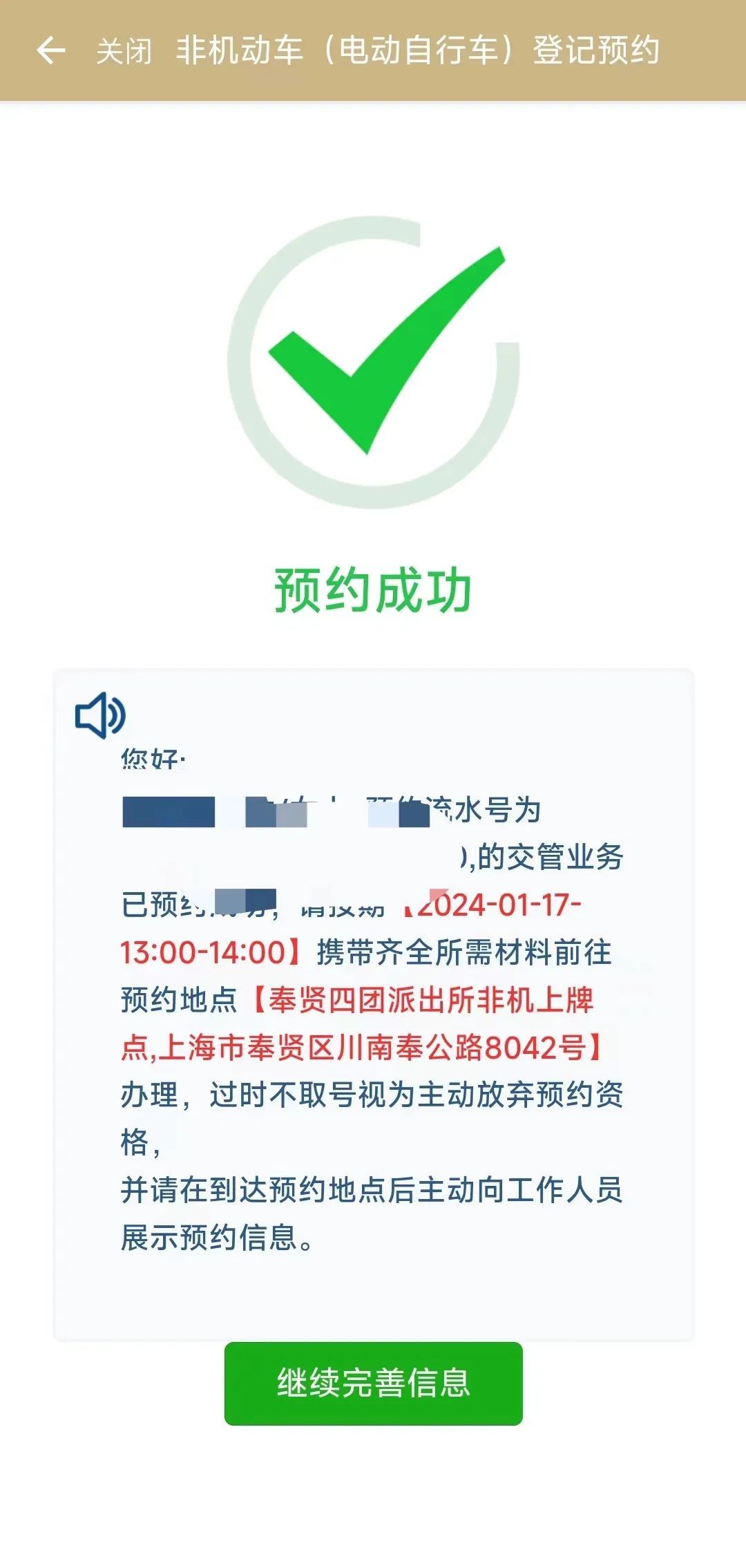 第六步:输入预约信息后,点击“确认”即表示预约成功,点击“继续完善信息”按钮进入下一步。