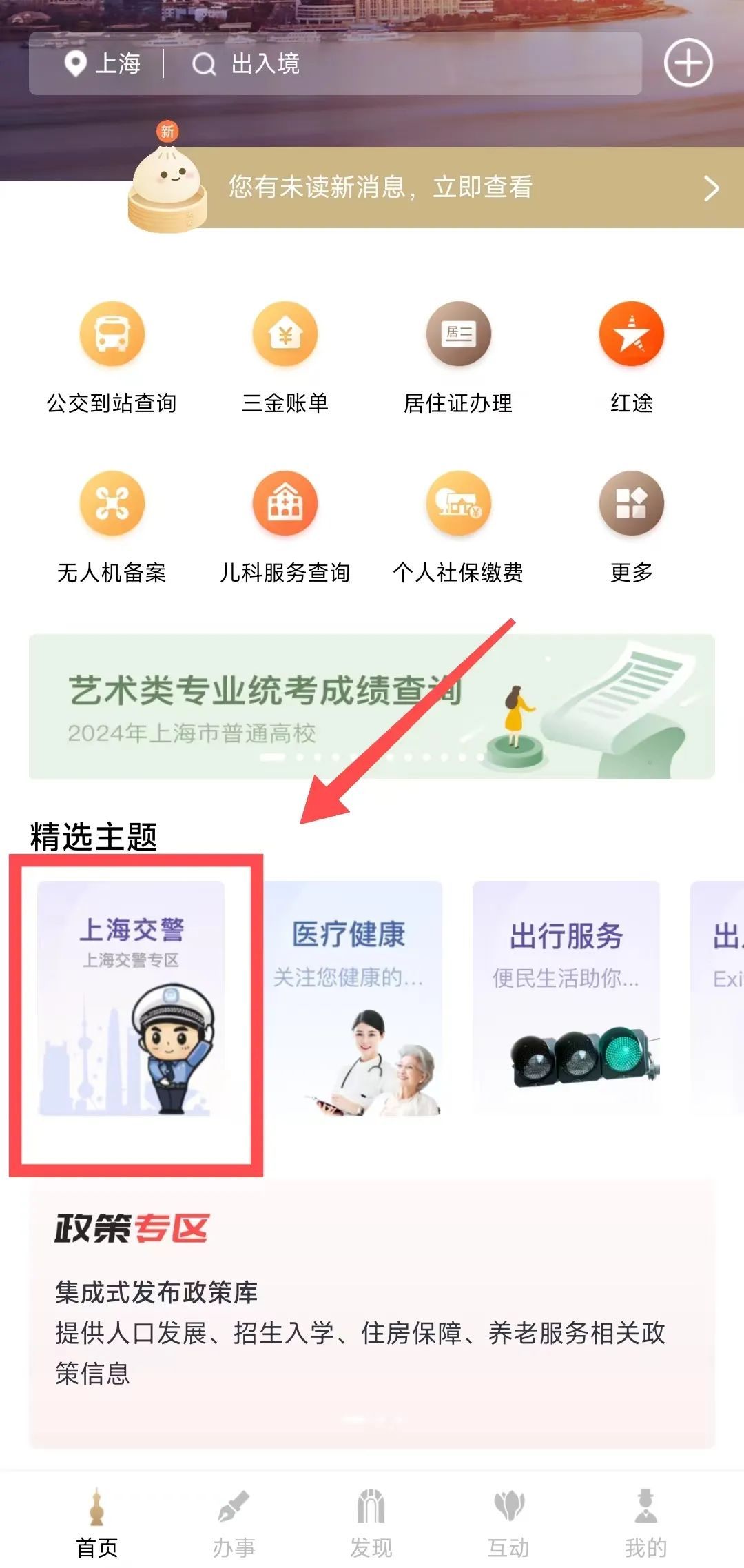 打开“随申办”(APP、支付宝小程序),首页点击“上海交警”专栏,一键直达!