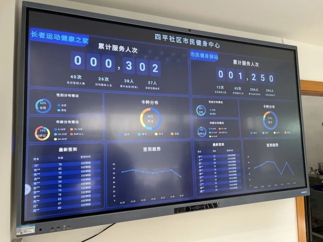 这还是一家“有脑”的智慧健身中心。四平社区市民健身中心采用智能门禁系统、信息管理系统、运动健康促进系统、数据监控系统、物联网技术,配置智能化设备、智能健康检测设备,进行运动健康数据采集与分析为市民健康管理提供数据管理,构建更高水平的全民健身公共服务体系,让快乐健身融入群众生活。通过高品质、高标准社区健康服务场所的打造,进一步织密健康服务网,不断升级优化社区居民健身环境。