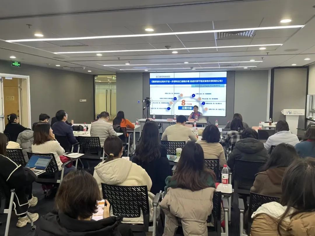 市税务局进出口税收管理处刘挺介绍了出口退税基本知识、出口退税精细服务如出口退税申报端“智能配单”工具、出口退(免)税备案单证云共享等功能,帮助企业线上处理、降低办税成本,还为企业解说了热点问题和案例。