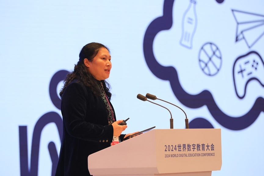 上海市黄浦区卢湾一中心小学校长吴蓉瑾作主旨发言(顾超 摄)全体会议环节中,6位中外专家分享了主旨发言,上海市黄浦区卢湾一中心小学校长吴蓉瑾以《数字教育:给孩子更温暖、更适合、更公平的教育》为题,分享了上海首个信息化标杆培育校——黄浦区卢湾一中心小学以数智技术为核心,逐步开启的数字教育新图景。成果发布环节,举行了世界数字教育联盟成立仪式、中国国家智慧教育公共服务平台国际版上线仪式,并展示了中国数字教育国际合作成果。大会期间,还将举行《数字教育前沿》创刊发布仪式,发布全球数字教育发展指数、《中国智慧教育发展报告2023》、国际数字教育案例汇编、2024世界数字教育大会上海倡议,举办“数智未来”教育展。