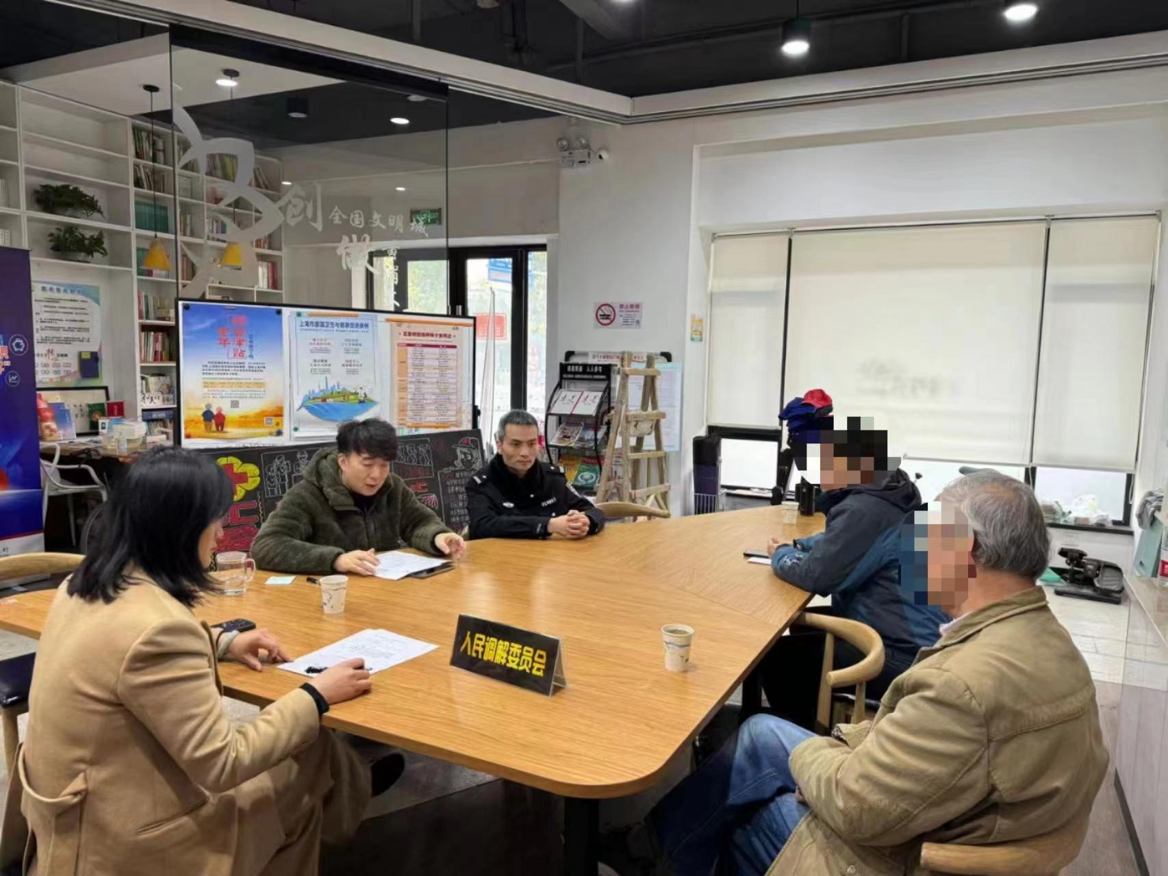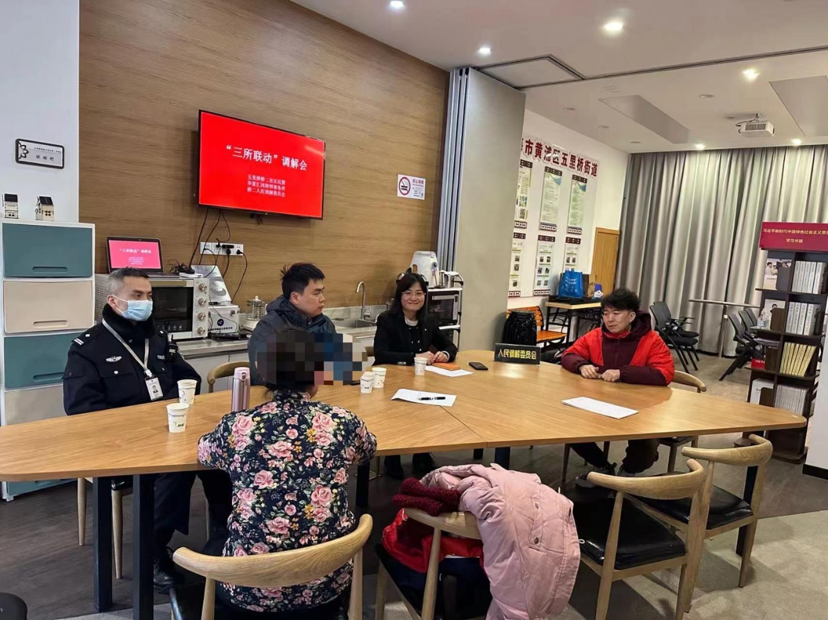 了解情况后,值班民警和社区民警合力劝解,双方情绪得以稳定,承诺会合理合法解决问题。社区民警谢皓在疏导双方情绪的基础上,启动“三所联动”机制,连同居委、律所、物业等多方力量,就楼上楼下房屋漏水纠纷一事,于2024年1月24日开展“三所联动”调解。