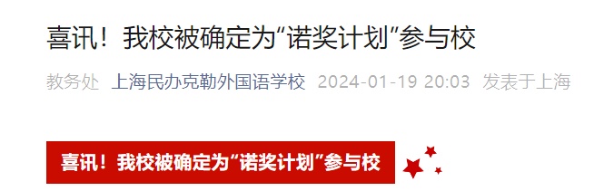 日前,本区上海民办克勒外国语学校在其微信公众号发布推文,“官宣”了其被确定为“诺奖计划”参与校的消息。