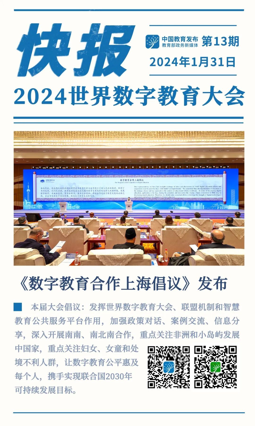 1月30日至31日,2024世界数字教育大会在上海召开。上海市副市长解冬代表主办方上海市人民政府在大会闭幕式发布成果文件《数字教育合作上海倡议》。倡议全文如下。