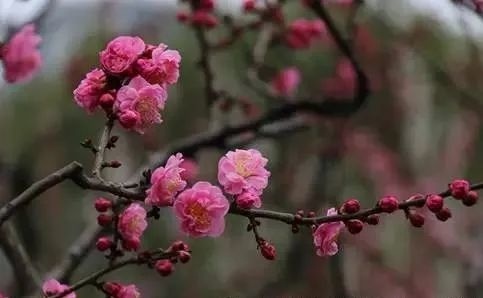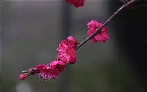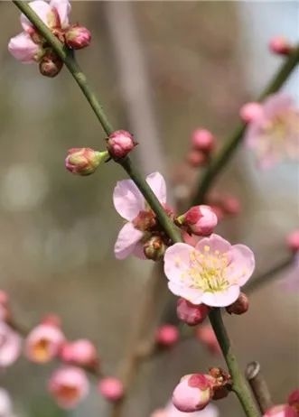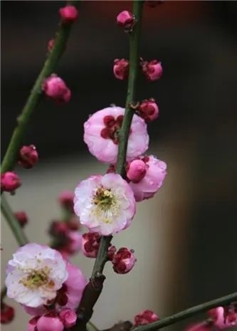 观赏特征:大枝具纵斑驳纹,黑紫褐色,皮孔中大且多,枝内新生木质部淡暗紫色。花蕾:深玫瑰红,扁圆至阔卵形。花色:红紫,反面同正面或略暗。花径:2.6(2.4~3.0)cm;雄蕊:四射后转辐射,花药土黄发紫晕。