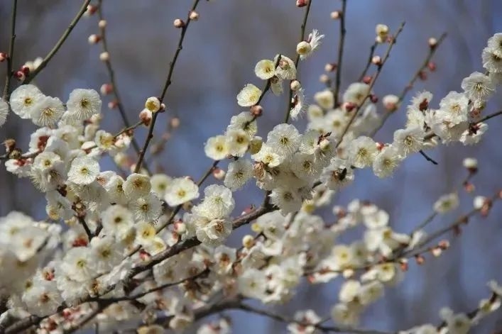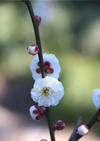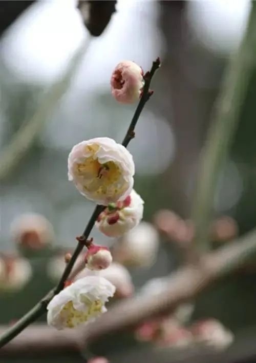 观赏特征:花径:1.5~2.8cm;花蕾:扁圆形,中心有孔,略暗淡紫桃红色,个别柱头外露。花色:正面淡紫,反面淡紫至略浓之紫,全花着色不匀。雄蕊:2~4,台阁状花心:常有台阁(梅花中把雌蕊变异成的小花称为台阁)。
