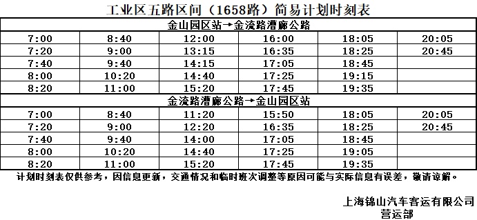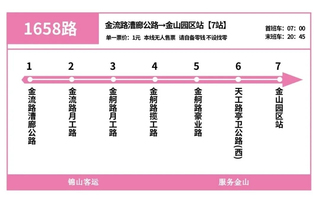 为改善公共交通运营环境,1658路始发站将搬至金山园区站。自2024年2月1日(本周四)起,锦山客运将对1658路部分线路走向、站点进行调整,具体情况如下: