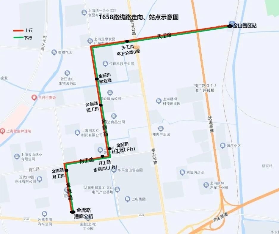上行(红色):自金山园区站起经天工路、金舸路、月工路、金流路至金流路漕廊公路止。
