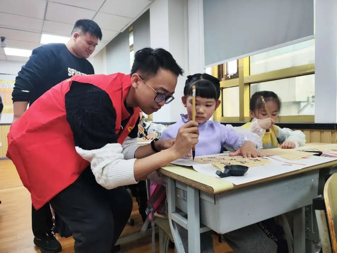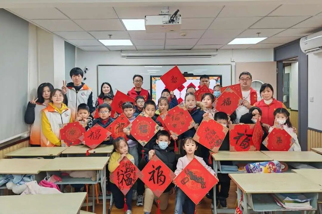 在“童心迎春写福字 同迎五福纳新春”环节,青年志愿者耐心细致地教孩子运笔挥毫,一笔一划书写出“福”字,现场其乐融融,洋溢着喜庆的氛围。