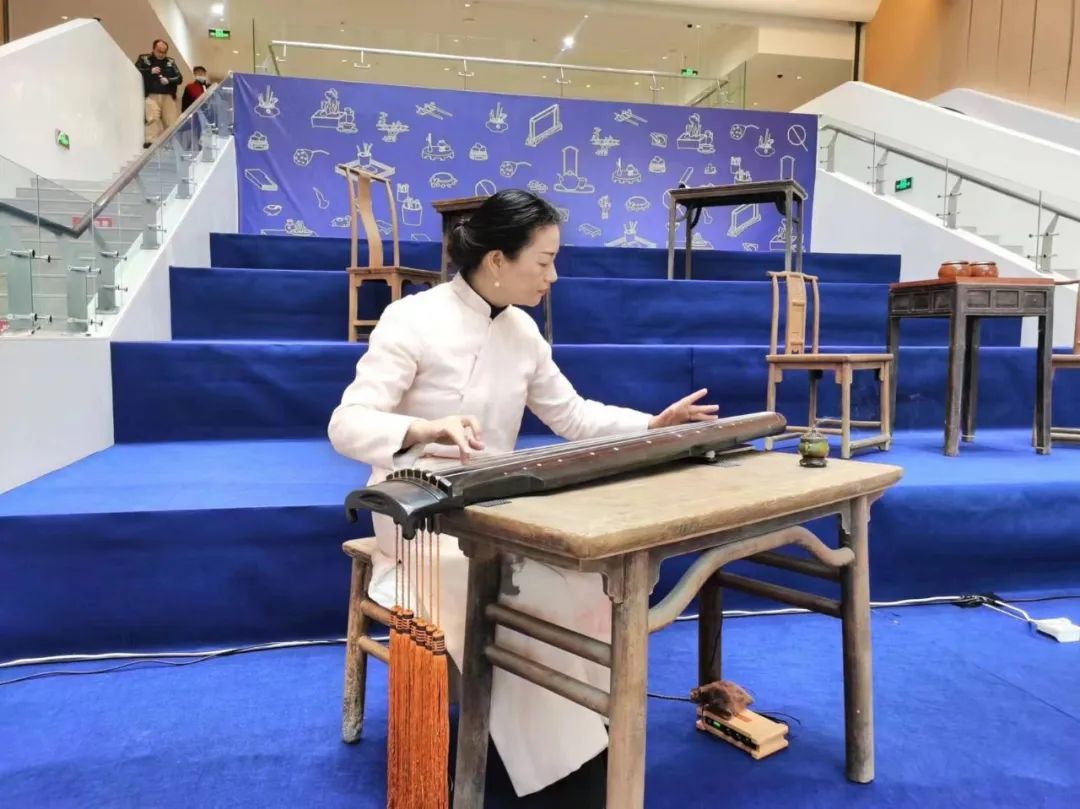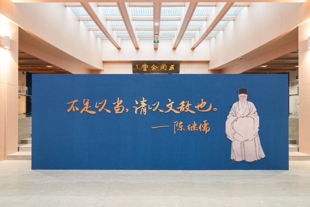 自一楼大厅起拾级而上,在二楼平台上,古琴师正在演奏,琴声悠扬。她身边的空地上,则错落展示着老式案几、木椅,文房氛围浓郁。继续往上走,四楼平台上,松江名士陈继儒的名言“不足以当,请以文敌也”醒目地立于其上,旁边还配有先生的画像。“这既是松江区文化底蕴的体现,也是中华传统文化的力量。”上海新闻报社社长、总经理秦川不住地赞叹。