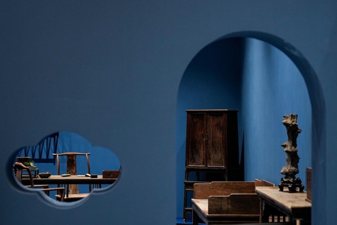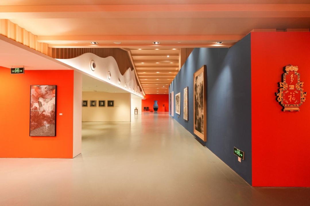 走进四楼主展厅,时尚大气的展陈空间设计让人眼前一亮,精美的供桌、古朴的条凳、手作的花窗,以及桌上小巧的笔山、刻花的水盂、剔透的玉印等展品目不暇接,还有一幅幅墨彩华溢的当代山水画,丰富的展品让人体会到了江南文化的深厚内涵。