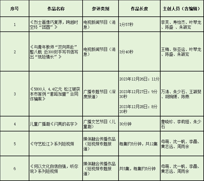 根据中国广播电视社会组织联合会城市台(融媒体协作)委员会《中国广播电视大奖2023年度广播电视节目奖初评作品报送通知》精神,松江区融媒体中心对拟参加中国广播电视大奖2023年度广播电视节目奖广播电视节目奖初评的6件作品予以公示: