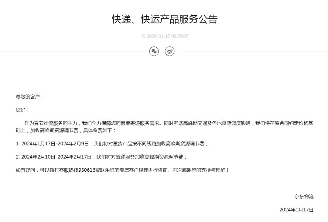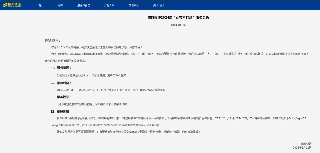 受法定节假日等因素影响,春节期间邮件时限可能延长。部分区域将加收资源调节费,收费标准详询当地网点或工作人员。