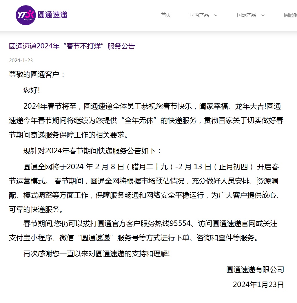 据圆通速递官网,圆通全网将于2024年2月8日(腊月二十九)-2月13 日(正月初四)开启春节运营模式。春节期间,圆通全网将根据市场预估情况,充分做好人员安排、资源调配、模式调整等方面工作,保障服务畅通和网络安全平稳运行,为广大客户提供放心、可靠的快递服务。